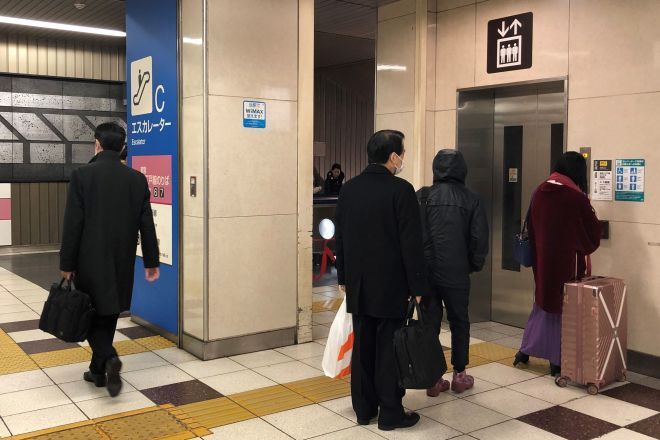 「今日は何回目で乗れるかな……」。覚悟を決めて、列に加わります。このエレベーターはあまり広くなく、ベビーカーが2台ぐらい入るといつも「いっぱい」になります。ベビーカー利用者以外にも人はいるので、何回か見送ることになります。