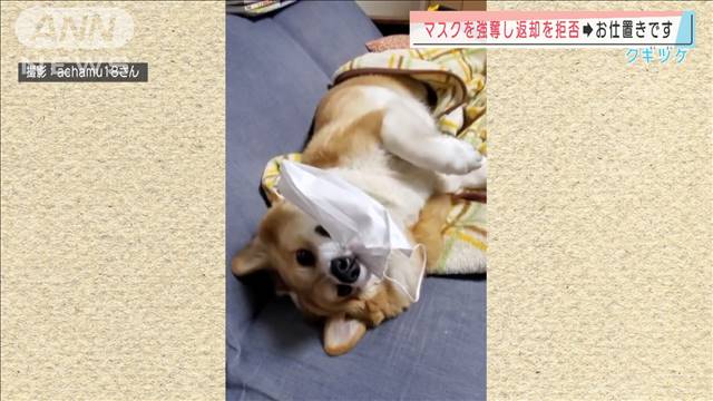 おうちの人が帰ってきました。すると、8歳のオス、犬の風太くんが駆け寄ります。お目当ては…。顔からはぎ取ったのは、マスクです。そして、何食わぬ顔で逃走。やりたい放題の風太くんに飼い主さんがお仕置きです。