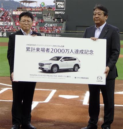 同社は社会貢献活動の一環として、来場者が100万人を達成するごとに社会福祉団体に車1台を寄贈している。2千万人は平成21年4月の開場から739試合目となる先月13日の広島対巨人戦で達成した。