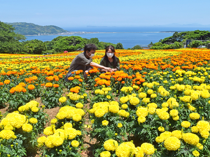 マリーゴールドの花畑は博多湾が見渡せる高台にあり、初夏のまぶしい日差しを浴びた花々が、爽快感のある青い海に映えている。妻と訪れた60代の男性は「新型コロナウイルス禍で外出を控えていただけに、晴れ晴れした気分になる。潮風も心地いい」と話していた。摘み放題に参加する人はスコップや袋の持参を。同園=092(881)2494。 (下村佳史)