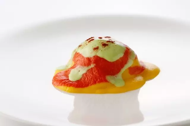 ローストしたタマネギにピーナツバターを挟み込んだ一品には、黄色と赤色のパプリカソースが彩りを添える。卵や乳製品も含めて動物性食品をいっさい口にしないビーガン向けのコースでは、パプリカが主役にもなる。「パプリカそのものの味が強く、糖度も高い。そのまま生で食べても、煮詰めてソースにしてもおいしい」