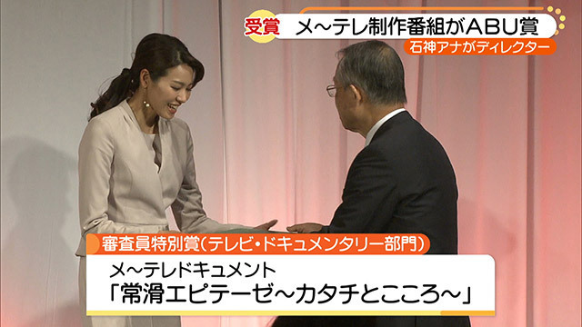 アジア・太平洋放送連合が主催する「ABU賞2019」の授賞式が21日に東京で行われ、メ~テレが制作した「常滑エピテーゼ~カタチとこころ~」がテレビ・ドキュメンタリー部門の最優秀賞に次ぐ審査員特別賞を受賞しました。
