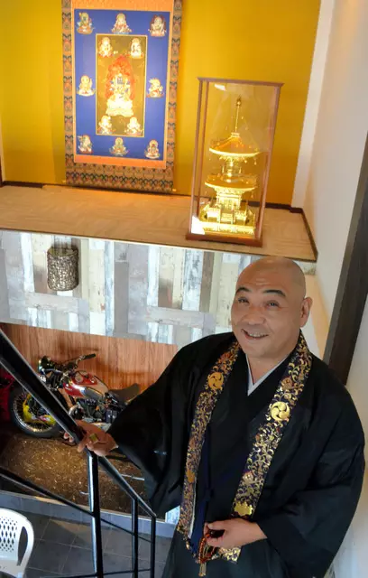 1934年製の英国のバイク「アリエル・レッドハンター」が納まる展示スペースの上には、不動明王の掛け軸と黄金の多宝塔の模型。三重県伊勢市の「ライダーズカフェ 寺住(てらす) 明王寺(みょうおうじ)」は、山平善清さん(47)が住職を務める明王寺の敷地内にある。不動明王は、明王寺の本尊。カウンター数席と机が一つ、数人で囲めるテラス席と個室。カフェで食事するかたわら道中安全祈願(3千円)も可能な、お寺のカフェだ。