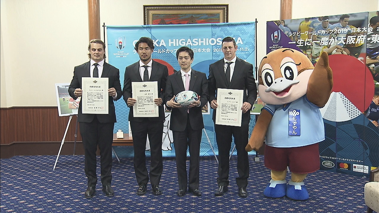ラグビーワールドカップで史上初のベスト8進出を果たした日本代表のうち、大阪ゆかりの選手らに大阪府から「感動大阪大賞」が贈られました。