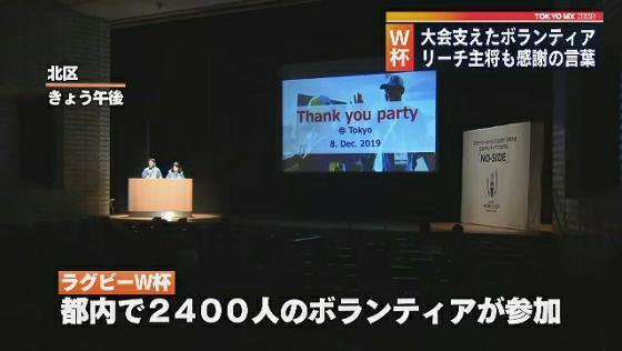 今回のワールドカップで都内の試合会場では、およそ2400人のボランティアが運営に携わりました。彼らをねぎらうため、東京都と大会組織委員会が昨日と今日の2日間、開いた催しには合わせて1600人ほどが参加しました。