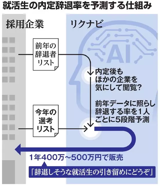 企業は、採用活動で向き合っている就活生の内定辞退を減らしたい。前年の辞退者の名簿を渡すと、リクナビは、その一人一人が、いつ、どの企業をどれほど閲覧していたか、人工知能(AI)で分析する。内定後も他の企業を閲覧していたか、といった具合だ。