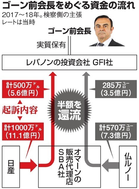 日産自動車の前会長カルロス・ゴーン被告(65)が中東オマーンの販売代理店に支出した日産の資金約5億6千万円を自らに還流したとされる特別背任事件(オマーンルート)をめぐり、前会長が、仏ルノーの資金についても約3億5千万円を還流させていたことが、東京地検特捜部の調べでわかった。いずれもCEO(最高経営責任者)の裁量で使える資金が原資になっていた。地検はルノーで先に作った仕組みを日産にも適用したと、公判で立証する方針だ。▼27面=検察の狙い