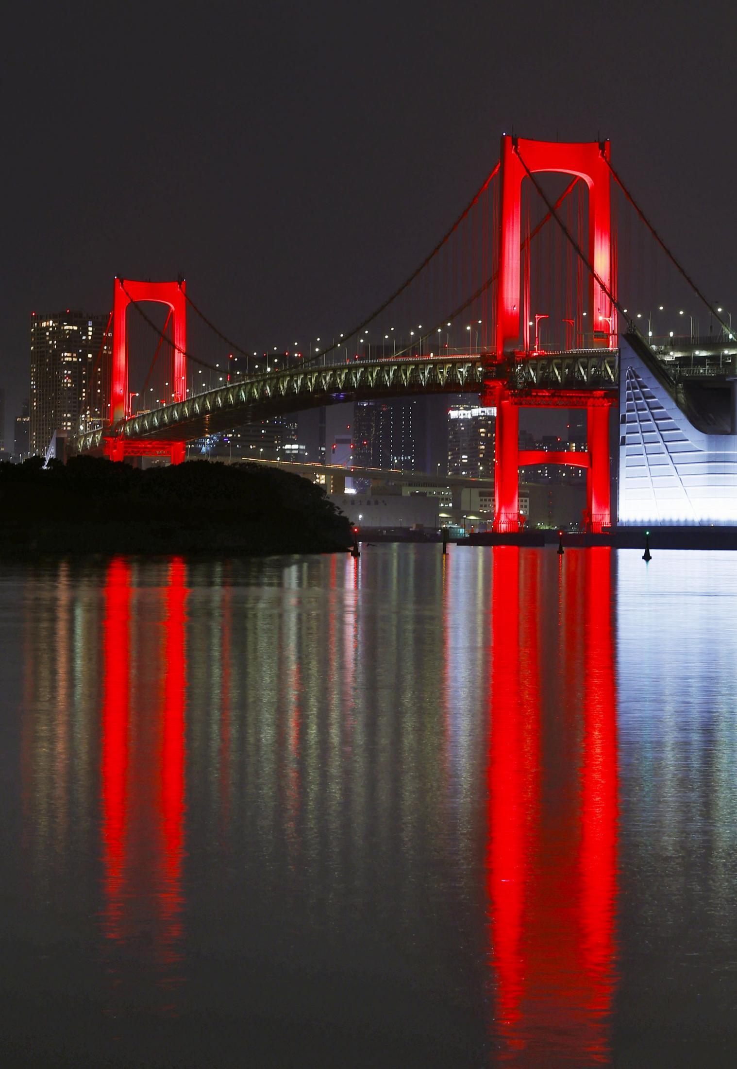 緊急事態宣言が解除された5月25日以降、夜間は感染状況が落ち着いていることを示す7色の光に照らされていたが、いったん消灯。午後11時ごろ、黒い海に真っ赤な橋桁が浮かび上がった。