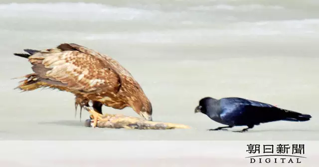 北海道東部の網走湖(網走市と大空町)の氷上で、サケの死骸をめぐり、オジロワシとカラスがにらみ合いをしていた。カラスはオジロワシからサケを横取りしようと少しずつワシに接近。これに対し、ワシは獲物を奪われまいと両脚でサケを押さえつけ、鋭い眼光と太いくちばしでカラスを威嚇する。貴重な食料争奪の攻防はまさかの結末を迎えた。