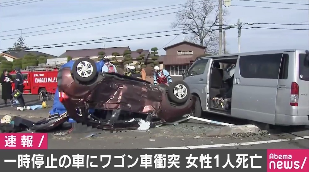 12月1日午前9時50分ごろ、大和町のT字路交差点で一時停止していた乗用車に左側から来たワゴン車が衝突。衝突された乗用車は横転して激しく損傷し、乗っていた60代の女性が搬送先の病院で死亡が確認された。そのほか、男女2人が重傷、双方の車の3人が軽傷を負っている。
