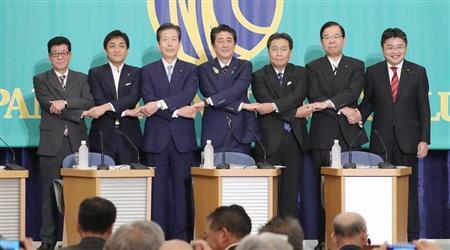 参院選(4日公示-21日投開票)に向け、主要各党の党首が3日、東京・内幸町の日本記者クラブで討論した。各党首は冒頭、参院選で一番訴えたいことをボードで示した。