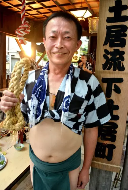 舁(か)き山がいよいよ博多の町を走り出した10日の「流舁(ながれが)き」。KBCの役員待遇エグゼクティブアナウンサー、沢田幸二さん(61)は、降りしきる雨と勢(きお)い水でびしょびしょになりながら、締め込み姿で駆けた。所属は土居流の下(しも)土居町。13日の「集団山見せ」では台上がりの大役を務めた。