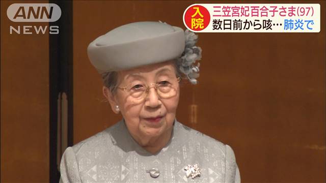 三笠宮妃百合子さま(97)が肺炎と診断され、入院されました。 宮内庁によりますと、百合子さまは24日午後、聖路加国際病院で定期健診を受けたところ、肺炎と診断されたため、そのまま入院されたということです。百合子さまは数日前からせきや体のだるさを訴えられていました。会話などもできていて、約1週間入院して投薬治療が行われる予定だということです。百合子さまは月に1回程度のペースで定期健診を受けられていましたが、前回までに肺に異常などは見られなかったということです。