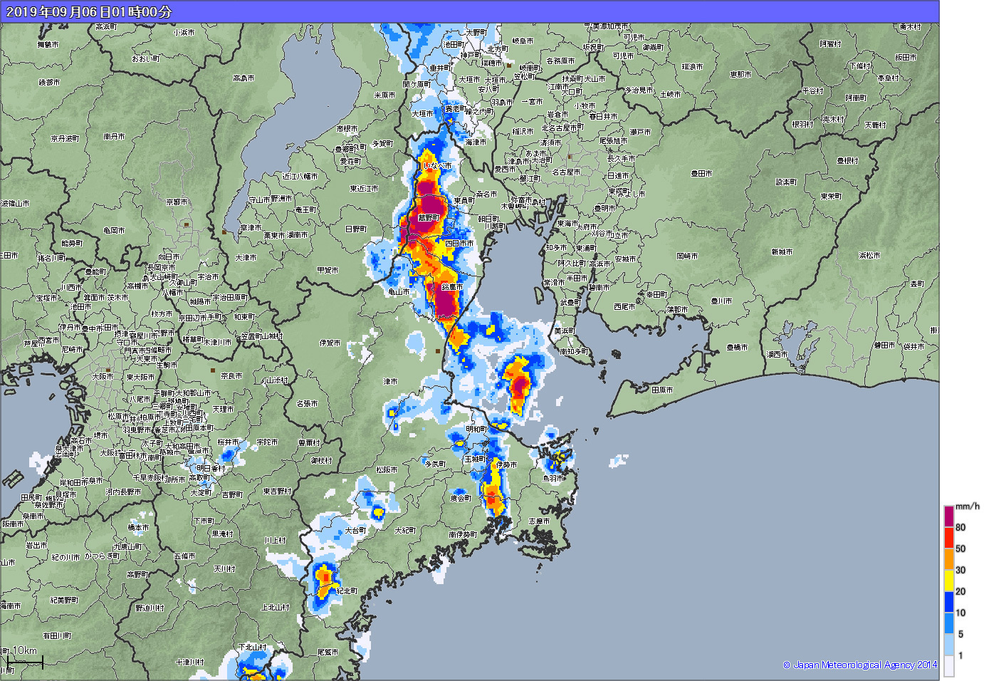1時間に80ミリ以上の猛烈な雨を観測または解析し、さらにその地域にとって数年に一度程度しか発生しないような大雨である場合に発表される情報。周辺地域では、土砂災害や河川の増水など、災害の危険性が高まっているため警戒が必要となる。