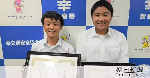 川で溺れている人を見つけ、救助に尽力したとして、神奈川県警幸署が、いずれも川崎市立南加瀬中学校1年の渡辺薫さんと佐波比呂斗さんに感謝状を贈った。