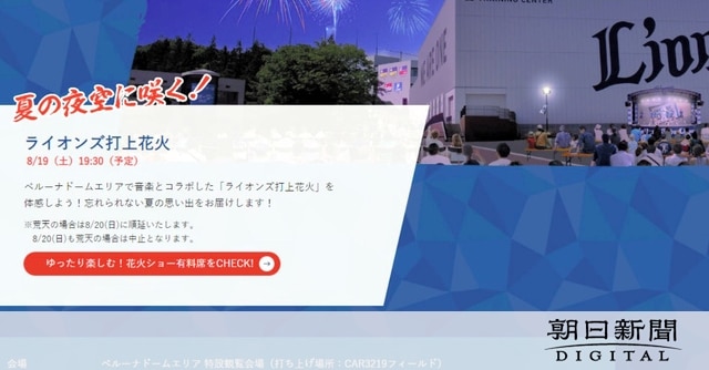19日夜、埼玉県所沢市内を走行中の車に、打ち上げ花火の不発玉が落下したと消防に通報があった。付近では埼玉西武ライオンズのイベントがあり、同球団によると19日午後7時半から同8時に約1200発の花火を打ち上げていた。不発の花火玉は、記された数字などからイベントで打ち上げた1発と確認したという。