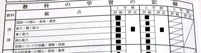 それでも教師の「テストだけは来てください」との勧めに従って、技能教科を除く教科の定期考査は受けた。もともと成績優秀だったこともあり7~9割は得点した。通知表の評定は欠席しがちになった2学期は1学期より下がり、3学期は全て「/(斜線)」。学校側は「評価はない」と伝えてきたという。