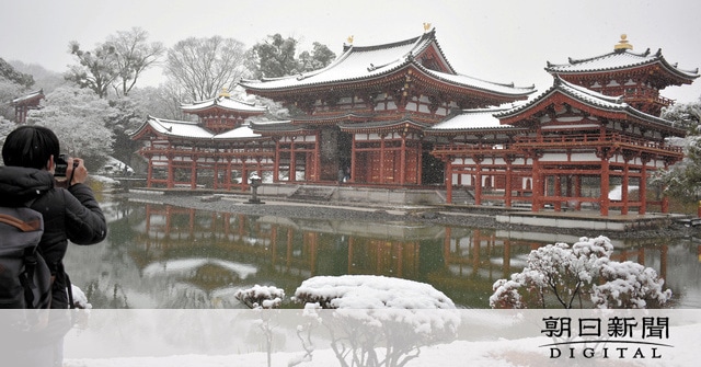 宇治市にある世界遺産・平等院も国宝の鳳凰(ほうおう)堂と屋根にある鳳凰が雪化粧した。参拝者は幻想的な光景にカメラや携帯電話を向けていた。寺によると、本格的な積雪は2年ぶり。年に一度あるかないかの珍しい光景という。