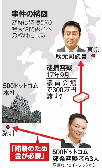 カジノを含む統合型リゾート(IR)事業をめぐる汚職事件で、衆院議員の秋元司容疑者(48)に賄賂を渡したとして逮捕された中国企業「500ドットコム」の副社長を名乗る鄭希容疑者(37)が、本社に対して「賄賂のための金が必要だ」と伝えていたことが関係者への取材でわかった。東京地検特捜部はこのやりとりが記録された電子データを押収。秋元議員に渡ったとされる現金が賄賂だったことを示す重要な証拠とみて調べている。