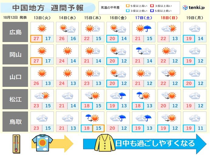 14日は、日本海から寒気が流れ込む影響で、気温の変わり目になりそうです。山陰や山陽北部では、これまでほど気温が上がらず、最高気温は20℃を少し超えるくらいとなるでしょう。風が冷たく感じられてきそうです。 また、週末からは気圧の谷の影響で雲が広がりやすくなり、雨の降る日もあるでしょう。冷たい空気に覆われて、日差しも届きにくくなると、日中も気温が上がりにくいでしょう。一段と秋が深まる見込みです。 今週前半と後半で、最高気温が大きく変わってくるため、服装などで調節し、体調を崩さないようお気をつけください。