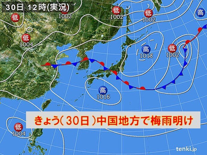 正午の天気図では、北陸地方から東海地方にかけて梅雨前線が停滞しており、中国地方から徐々に梅雨前線が遠ざかり始めたためです。