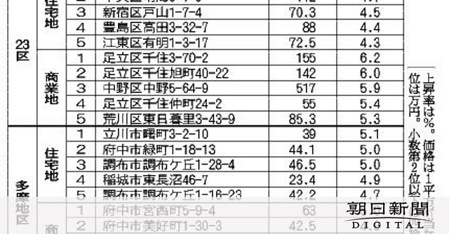 住宅地は都内全体で1・5%の上昇(昨年は0・2%)。区部で上昇率が最も高かったのは中央区(4・0%)で、有楽町線と大江戸線があって便利な月島、東京五輪・パラリンピックの選手村だったマンション群がある晴海などのエリアが人気で、上昇を支える。これに続くのは、電車の主要路線が多く利便性の高い新宿区(3・7%)、中野駅前の再開発が進む中野区(3・3%)など。多摩地区では国立市(2・7%)や武蔵野市(2・6%)も堅調だった。都担当者は「いずれも中央線沿線で都心部へのアクセスが良い。武蔵野市は吉祥寺というブランドもあり、人気が根強い」と話す。