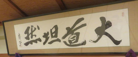中曽根氏が寄贈した書が掲げられている。「大道坦然」。鎌倉幕府の5代執権・北条時頼の辞世の句。その末尾だ。政治の頂点を極めた時頼が「目に映る現世という鏡を打ち砕いたら、そこには思いもかけない大きな道が広がっていた」という意味がある。改革を断行した中曽根氏の精神が書に宿っている。