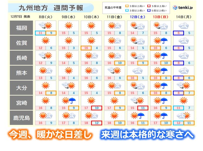 今週、九州は高気圧に覆われて、日中は暖かな日差しに恵まれる日が多いでしょう。来週は冬型の気圧配置に変わり、強い寒気が流れ込み、気温が急降下します。本格的な冬の寒さが訪れますので、今週のうちに暖房器具の準備など寒さへの備えをしておきましょう。