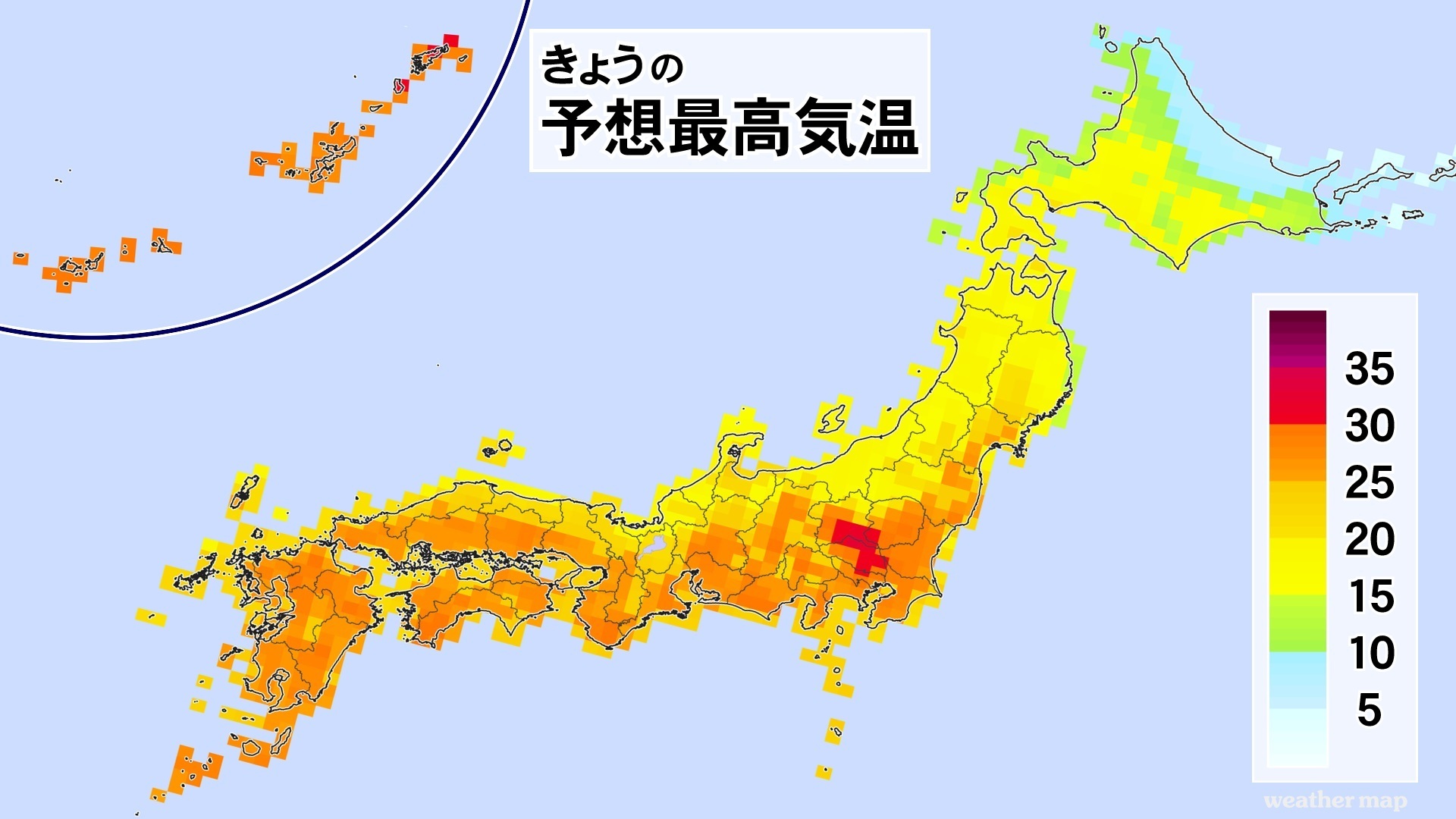 最高気温は25℃を超える所が多く、前橋・甲府・日田(大分)などでは30℃以上の真夏日になりそうだ。東京も29℃の予想で、今年一番の暑さになる可能性がある。湿度もそこまで低くないため、家の中でも熱中症の危険性が高まるおそれがあり、喉が渇く前に水分をとったり、無理せず冷房を使用するなどの熱中症対策を心がけたい。