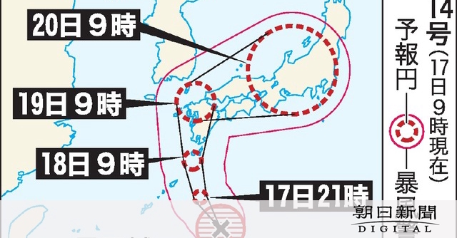 気象庁は17日夕、大型で猛烈な台風14号の接近を受け、九州北部と四国で18日午前から19日にかけて、短時間で集中豪雨をもたらす「線状降水帯」が発生する可能性があると発表した。