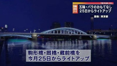 東京都は水辺のにぎわいを生み出そうと、隅田川に架かる10カ所の橋のライトアップ工事を行ってきました。このうち、工事が終わった駒形橋、厩橋、蔵前橋の3つの橋で、25日からライトアップを始めることにしました。25日はパラリンピック開幕の1年前に当たることから、およそ2週間の期間限定でパラリンピックのシンボルカラー=赤・青・緑に輝くということです。残りの7つの橋は、大会までに工事を終える予定です。