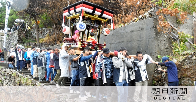 14日昼過ぎ。島の高台に立つ春日神社の境内から40人ほどに担がれた櫓(やぐら)が降りてきた。祭りの始まりを告げる「おさがり」だ。