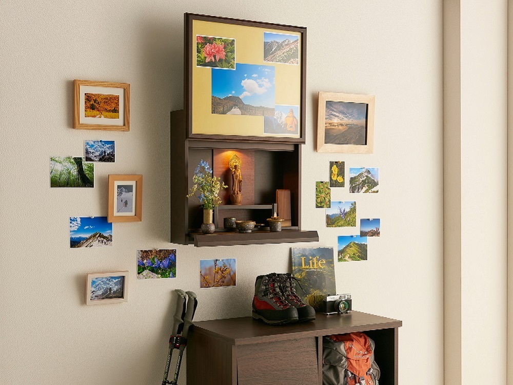 スペースを取りすぎないようにと、考えて設計された仏壇もあり、扉が上に開く仏壇や、壁かけタイプの仏壇も…。