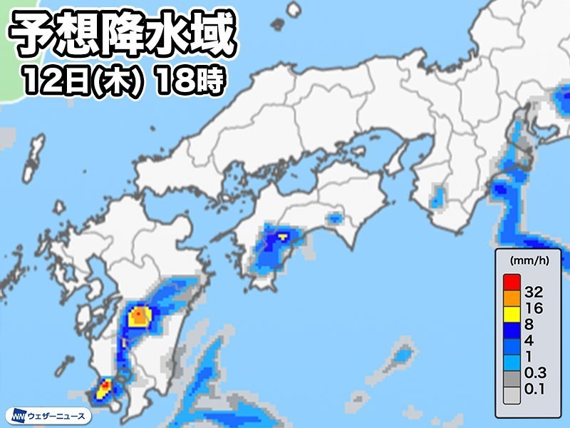 九州や四国では午後から夜にかけて、紀伊半島周辺では、今夜から明日早朝にかけて激しい雨による道路冠水や落雷による停電などに注意が必要です。
