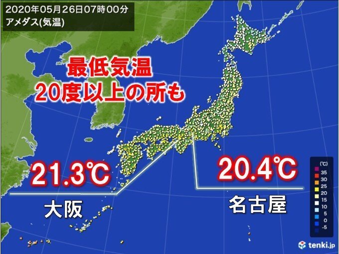 きょう26日は、九州から東海を中心に暖かい朝に。名古屋や大阪、福岡の朝の最低気温は20度を下回らず、今年これまでで最も高くなりました。