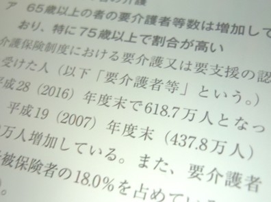 政府が18日の閣議で決定した2019年版の「高齢社会白書」では、介護保険制度で要介護・要支援の認定を受けた人が増加していることを指摘。介護が必要となった主な要因については、認知症が最も多いことを取り上げている。【新井哉】