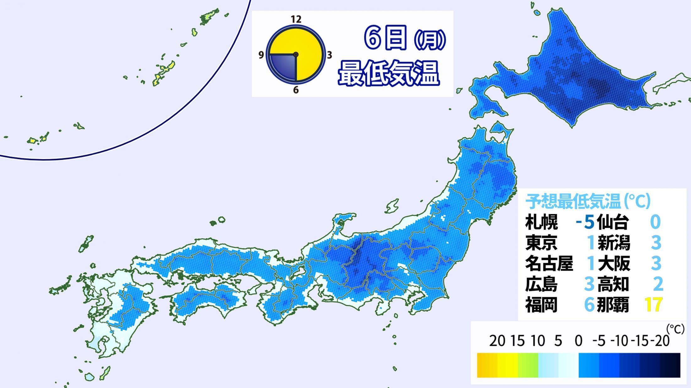 6日(月)の朝は冷え込みが強まり、各地で布団から出るのが辛いような寒さとなりそうだ。また、週の中頃は西日本や東日本を中心に雨や風が強まり、荒れた天気になるおそれがある。