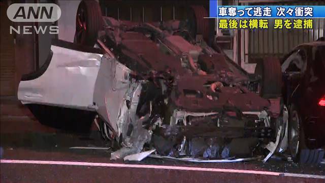 大阪市で男が他人の車を奪ってそのまま逃走し、次々と衝突事故を起こした挙句、逮捕されました。 20日午後10時ごろ、大阪市天王寺区寺田町で男が突然、他人の車を奪ってそのまま逃走しました。通報を受けたパトカーが捜索を始めたところ、数分後に生野区の路上でこの乗用車が横転しているのが見つかりました。