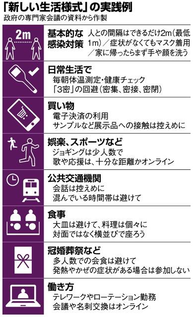新型コロナウイルスの対策を検討する政府の専門家会議(座長=脇田隆字・国立感染症研究所長)は4日、感染の広がりを長期的に防ぐための「新しい生活様式」の具体例を公表した。日常生活のなかで、この生活様式を心がけることで、新型コロナだけでなく、ほかの感染症の広がりも防ぐことができ、自分自身だけでなく家族や友人らの命を守ることにつながる、としている。全文は以下のとおり。