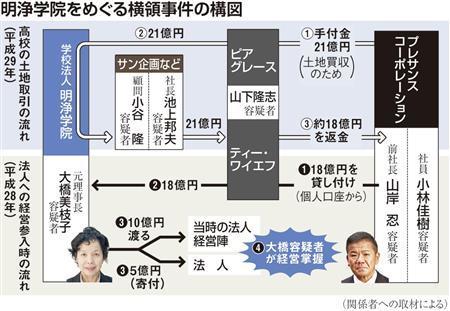 100年近い歴史を持つ伝統校に、なぜ急成長を遂げた不動産会社の社長らが近づいていったのか。明浄学院高(大阪市阿倍野区)などを運営する学校法人明浄(めいじょう)学院をめぐる21億円の横領事件で、大阪地検特捜部は今月、業務上横領容疑で法人元理事長や東証1部上場の不動産会社のトップら6人を相次ぎ逮捕した。それぞれの複雑な思惑をひもとくと、大阪市内に残された広大な一等地をめぐる長期的な計画が浮かび上がってくる。
