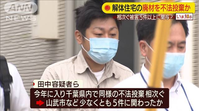 千葉県内で不法投棄を繰り返していた可能性があります。 船橋市の建設会社の社長・田中誠人容疑者(34)ら2人は5月、解体した住宅の廃材を船橋市内に不法に投棄した疑いが持たれています。捜査関係者によりますと、千葉県内では今年に入って同様の不法投棄が相次いでいて、田中容疑者らは少なくとも5件に関わっている可能性が高いということです。警察が余罪を調べています。