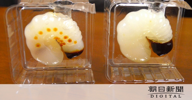 この提案を受けた食品開発部竹内亮人さん(36)は図鑑で幼虫を隅々まで観察した。リアルさを追求し、立体的な形状や大きさ、重さを再現するため、「ゼリー」に行き着き、1年かけて型をとるトレーのメーカーと試作を繰り返した。