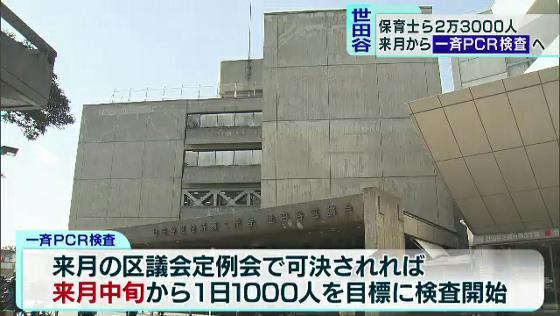 東京・世田谷区は、区内で勤務する全ての保育士や介護施設職員らおよそ2万3000人を対象に、新型コロナウイルスのPCR検査を一斉に行う方針を固めました。 区によりますと、一斉PCR検査の対象となるのは、区内で働く介護施設や保育園・幼稚園などの職員のほか、特別養護老人ホームなどに新しく入所する予定者で、発熱など症状の有無にかかわらず、無料で検査を受けることができます。費用はおよそ4億円で、区への寄付金など含め、全額を公費で負担する予定です。