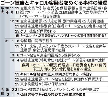 日産自動車前会長、カルロス・ゴーン被告(65)の会社法違反(特別背任)事件に絡み、虚偽の証言をしたとして東京地検特捜部が7日に偽証容疑で逮捕状を取った妻のキャロル・ナハス容疑者(53)が、ゴーン被告の保釈請求の際にも東京地裁に虚偽の証言をしていた疑いのあることが、関係者への取材で分かった。キャロル容疑者はオマーン・ルートの特別背任事件着手の約3カ月前から、重要な事件関係者にレバノンで面会するなど証拠隠滅を図っていたという。