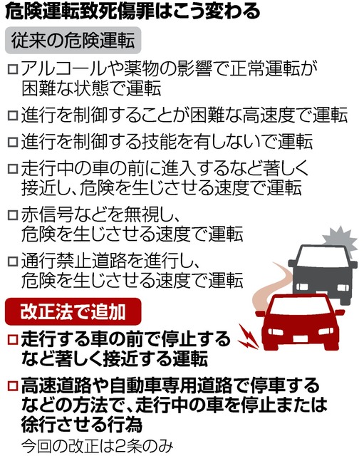 改正法は速度に関する要件を外した上で、①走行する車の前方で停止するなど著しく接近する運転②高速道路などで停車するなどの方法で走行中の車を停止または徐行させる行為――の二つも危険運転の分類に追加した。