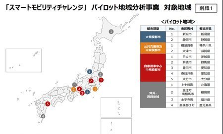 経済産業省ではスマートモビリティサービスの社会実装を通じた移動課題解決、地域活性化に挑戦する地域や企業を応援する新プロジェクト「スマートモビリティチャレンジ」を開始した。この中で、先駆的に新しいモビリティサービスの社会実装に取り組み、事業計画策定や効果分析に協力する地域・事業に応募した24の提案の中から「パイロット地域」として13を選定した。