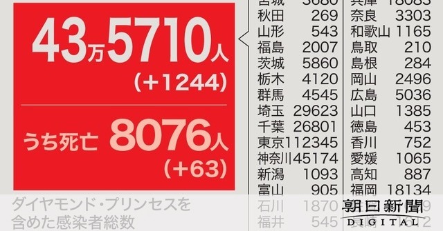 新型コロナウイルスの国内感染者は、3日午後8時現在で新たに1244人確認された。1日あたりの感染者が1千人を超えるのは2月27日以来4日ぶり。死者は新たに63人確認された。