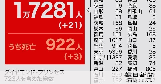 新型コロナウイルスの国内感染者は8日午後9時現在、4都道県で新たに計21人が確認され、累計で1万7281人になった。内訳は東京都13人、北海道4人、福岡県3人、岐阜県1人。死者は北海道、神奈川、兵庫で各1人増え、922人となった。