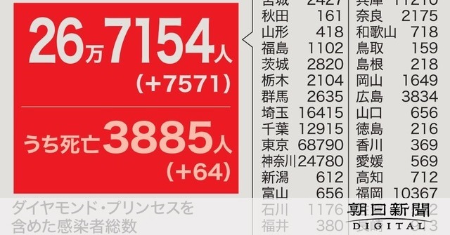新型コロナウイルスの7日の国内感染者数は午後10時現在で7571人となり、1日あたりの最多を3日連続で更新した。前日から1千人以上増え、初めて7千人を超えた。6日時点の重症者は全国で796人で、前日より12人増えてこれまでで最多となった。死者は64人増えた。