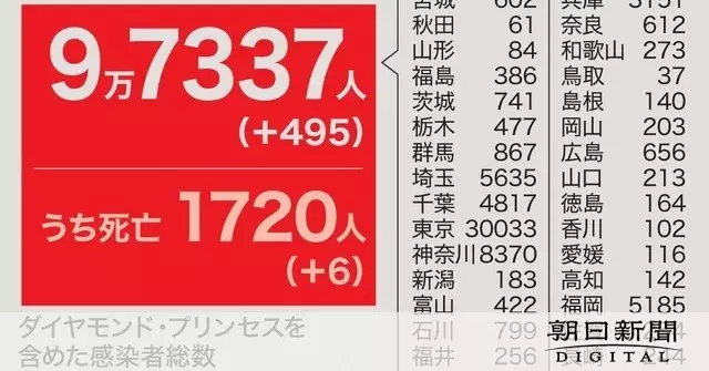 新型コロナウイルスの国内感染者は25日午後9時現在で、新たに495人が確認された。死者は6人増えた。東京都は124人で、6日連続で100人を上回った。都内の感染者は累計で3万33人になり、3万人を突破した。